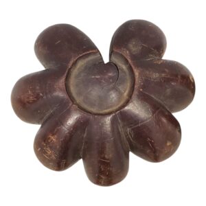 The head is a feat of symmetrical carving, articulated into a seven-lobed, floral silhouette. Each individual lobe is crowned with a shallow, circular cavity, creating a striking “rosette” formation. Unlike the standard single-well snuffkerrie, this heptagon configuration suggests a specialized purpose; perhaps for the presentation of distinct snuff blends or for communal ritual use. The interior of each well exhibits a soft, buttery smoothing, evidence of decades of use and the repeated extraction of fine powdered tobacco.