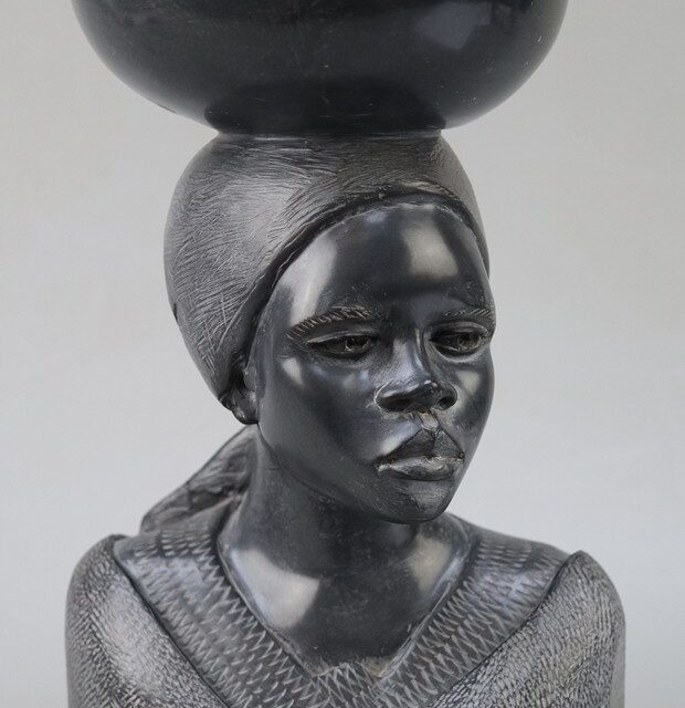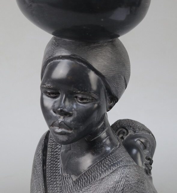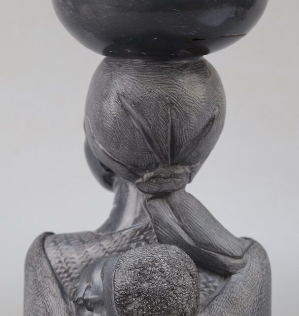 Crowning the composition is the traditional clay pot, a full, gleaming orb balanced impossibly atop her head. Its perfect spherical swell mirrors the gentle roundness of the mother’s form and the child’s curled body below, creating a vertical rhythm of curves that draws the eye upward in reverence. The pot, glossy and unadorned, symbolizes the daily ritual of carrying water; the life-giving essence drawn from the earth, while also evoking the burdens and blessings borne by women across generations in Shona culture. The stone’s natural sheen catches light in subtle shifts, turning the black depths into velvety midnight tones that seem to breathe with inner warmth.