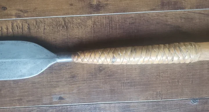 Materials: Forged iron blade, hardwood shaft, palm fiber binding