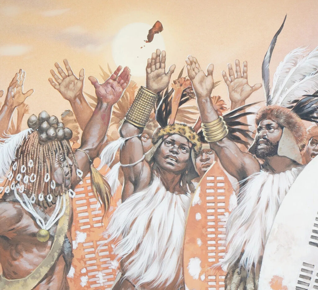 Angus McBride, Original Gouache on Board for African Zulus (signed), historical illustration created for Osprey Publishing, c. 1990